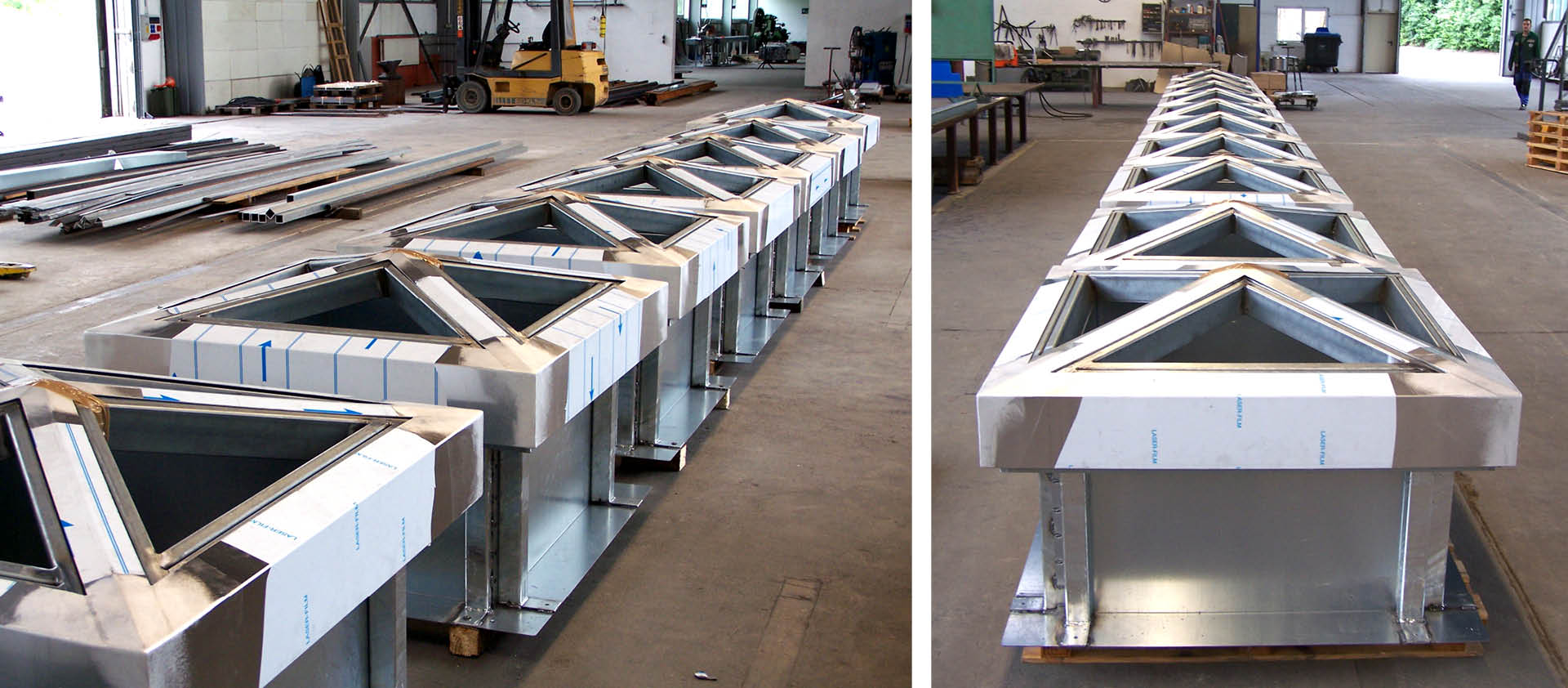 Als verlässlicher Partner namhafter Unternehmen aus dem Bereich der Tageslichtelemente fertigen wir in Kooperation individuelle Stahlunterkonstruktionen-/Konstruktionselemente für Glasdächer, Zargen, Zug- und Druckringe sowie Brandschutzelemente.